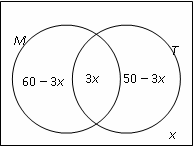 $\begin{align} & n(\xi )=90 \\ & n(M)=60 \\ & n(T)=50 \\ & n{{(M\cup T)}^{1}}=x \\ & n(M\cap T)=3{{(M\cup T)}^{1}}=3x \\ & 94=60-3x+3x+50-3x+x \\ & 94=110-2x \\ & 16=2x \\ & x=8 \\ & \text{only Modern music }=n(M\cap {{T}^{1}})=60-3(8)=36 \\ & \text{only Traditional music}=n({{M}^{1}}\cap T)=50-3(8)=26 \\ & \text{Those who like just one music}=n(M\cap {{T}^{1}})+n({{M}^{1}}\cap T) \\ & \text{ }=36+26=62 \\\end{align}$