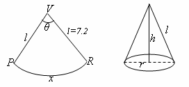 $\begin{align} & \text{Length of the arc}=x=\frac{\theta }{{{360}^{\text{o}}}}\times 2\pi l---(i) \\ & \text{Also }x\text{ is equal to the length of the perimeter of the } \\ & \text{circular base of the cone} \\ & x=2\pi r-----(ii) \\ & \therefore \frac{\theta }{{{360}^{\text{o}}}}\times 2\pi l=2\pi r;\text{ }\frac{\theta }{{{360}^{\text{o}}}}=\frac{r}{l} \\ & \frac{{{300}^{\text{o}}}}{{{360}^{\text{o}}}}=\frac{r}{7.2} \\ & r=\frac{{{300}^{o}}}{{{360}^{o}}}\times 7.2=6cm \\\end{align}$