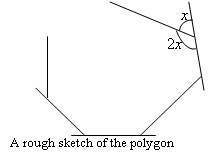 $\begin{align}  & {{x}^{o}}+2{{x}^{o}}={{180}^{o}}\text{     }\!\!\{\!\!\text{ sum of angle on a straight line }\!\!\}\!\!\text{ } \\ & 3{{x}^{o}}={{180}^{o}} \\ & x={{60}^{o}} \\ & \text{Total sum of exterior angle of a polygon is 36}{{\text{0}}^{o}} \\ & {{60}^{o}}n={{360}^{0}}\text{      }\!\!\{\!\!\text{ }n=n\text{umber of sides }\!\!\}\!\!\text{ } \\ & n=\frac{{{360}^{o}}}{{{60}^{o}}}=6-sides \\\end{align}$