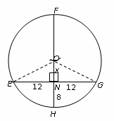 $\begin{align} & r=OE=OF=OG=OH\text{ }\!\!\{\!\!\text{ radius of circle }\!\!\}\!\!\text{ } \\ & NO=x \\ & OH=8+x,\text{ }OE=OF=OG=8+x \\ & O{{G}^{2}}=O{{N}^{2}}+N{{G}^{2}} \\ & {{(8+x)}^{2}}={{x}^{2}}+{{12}^{2}} \\ & {{x}^{2}}+16x+64={{x}^{2}}+144 \\ & 16x=80 \\ & x=5 \\ & FH=2(r)=2(OH)\text{ }\!\!\{\!\!\text{ Diameter of a circle }\!\!\}\!\!\text{ } \\ & FH=2(8+x) \\ & FH=2(8+5)=2\times 13=26 \\\end{align}$