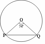 $\begin{align} & PO=OQ\text{ (radius of a circle)} \\ & O\overset{\wedge }{\mathop{P}}\,Q=P\overset{\wedge }{\mathop{Q}}\,O=x\text{ (Base angle of an issoceles }\Delta \text{)} \\ & \text{7}{{\text{4}}^{\text{o}}}+x+x={{180}^{\text{o}}} \\ & 2x={{106}^{\text{o}}} \\ & x={{53}^{\text{o}}} \\ & O\overset{\wedge }{\mathop{P}}\,Q={{53}^{\text{o}}} \\\end{align}$