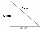 $\begin{align} & \text{Using Pythagoras theorem} \\ & {{a}^{2}}+{{a}^{2}}={{2}^{2}} \\ & 2{{a}^{2}}=4 \\ & {{a}^{2}}=2c{{m}^{2}} \\ & a=\sqrt{2}cm \\ & \text{Area of triangle}=\tfrac{1}{2}\cdot b\cdot h \\ & A=\tfrac{1}{2}\times \sqrt{2}\times \sqrt{2}c{{m}^{2}}=\frac{2}{2}c{{m}^{2}}=1c{{m}^{2}} \\\end{align}$