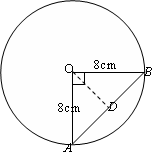 $\begin{align} & \text{Line OD is perpendicular bisector of line }AB \\ & \text{Also it divide }A\overset{\wedge }{\mathop{O}}\,B\text{ into 4}{{\text{5}}^{\circ }}\text{ each} \\ & \text{Consider the right angle triangle }AOD \\ & \sin {{45}^{\circ }}=\frac{AD}{8cm} \\ & AD=8\sin {{45}^{\circ }}cm=8\times \frac{1}{\sqrt{2}}cm=\frac{8\sqrt{2}}{\sqrt{2}\times \sqrt{2}}cm \\ & AD=\frac{8\sqrt{2}}{2}=4\sqrt{2}cm \\ & AB=2AD\text{ (}OD\text{ is }\bot \text{ar bisector of }AB) \\ & AB=4\sqrt{2}\times 2cm=8\sqrt{2}cm \\\end{align}$