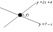 The distance between the point (4,3) and the intersection of y = 2x + 4 and y = 7 – x