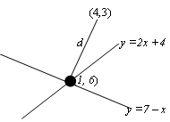First, we need to obtain the point of intersection of the two lines y = 2x + 4 and y = 7 – xTo get the point of intersection, we solve the two equations simultaneously$y=2x+4----(i),\text{ }y=7-x----(ii)$Substitute y =7 – x into (i)$7-x=2x+4,\text{ }3x=3,\text{ }x=1$Substitute 1 for x in y = 7 – xy = 6(x, y) = (1, 6)The diagram is rough sketchThe distance between (1, 6) and (4,3) is$d=\sqrt{{{(1-4)}^{2}}+{{(6-3)}^{2}}}=\sqrt{{{3}^{2}}+{{3}^{2}}}=\sqrt{18}=3\sqrt{2}$