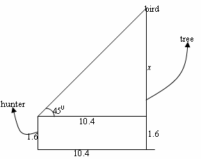 A hunter 1.6m tall views a bird on top of a tree at an angle of 45o. If the distance between the hunter and the tree is 10.4m. Find the height of the tree.