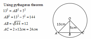 Jambmaths question: A chord is drawn 5cm away from the centre of a circle of radius is 13cm. Calculate the length of the chord. Option A: 7cm Option B: 9cm Option C: 12cm Option D: 24cm Jamb Maths Solution: Jamb Maths Topic: Circles and Circles theoremsYear of Exam: Jamb Maths 2018