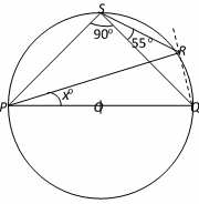 $\begin{align} & \text{consider }\Delta PSQ \\ & \angle PSQ={{90}^{o}}\text{ }\!\!\{\!\!\text{ angle in semicircle }\!\!\}\!\!\text{ } \\ & \angle QSR={{145}^{o}}-{{90}^{o}}={{55}^{o}} \\ & \text{Join point }P\text{ and }Q\text{ together} \\ & \text{Consider }\Delta QRS\text{ and }\Delta RQP\ \text{which has }QR\text{ has its base} \\ & \angle RPQ=\angle QSR={{55}^{o}}\text{ }\!\!\{\!\!\text{ Angle on the same segment and base }\!\!\}\!\!\text{ } \\ & \angle RPO=x={{55}^{o}} \\\end{align}$