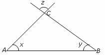 $\begin{align} & \vartriangle ABC \\ & \angle ACB=z\text{ }\!\!\{\!\!\text{ vertically opposite angles }\!\!\}\!\!\text{ } \\ & x+y+z={{180}^{\circ }}\text{ }\!\!\{\!\!\text{ sum of }\angle \text{s in a }\vartriangle \text{ }\!\!\}\!\!\text{ } \\ & x+y={{180}^{\circ }}-z \\\end{align}$