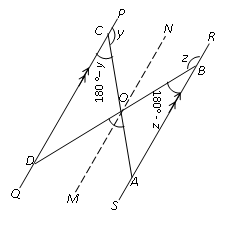 $\begin{align} & \text{Construction: Draw line }MN\text{ to pass through O, }\parallel \text{ to QP and SR} \\ & \angle DCO=180{}^\circ -\angle OCP\left| \text{Sum of }\angle \text{s on a straight line} \right. \\ & \angle DCO=180{}^\circ -y \\ & \angle ABO=180{}^\circ -\angle OBR\left| \text{Sum of }\angle \text{s on a straight line} \right. \\ & \angle ABO=180{}^\circ -z \\ & \angle CON=\angle DCO=180{}^\circ -y\left| \text{Alternate angles} \right. \\ & \angle BON=\angle ABO=180{}^\circ -z\left| \text{Alternate angles} \right. \\ & \angle COB=\angle DCO+\angle ABO \\ & \angle COB=180{}^\circ -y+180{}^\circ -z \\ & \angle COB=360{}^\circ -y-z \\ & \angle DOA=\angle COB=360{}^\circ -y-z\left| \text{vertically opposite angles} \right. \\ & \angle DOA=x=360{}^\circ -y-z \\\end{align}$