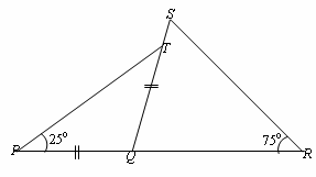 In the figure above, PQR is a straight line segment, PQ = QT . Triangle PQT is an isosceles triangle. $\angle QPT$is 25o . Calculate the value of $\angle RST$