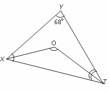 In the diagram $\overline{OX}$ bisects $\angle YXZ$ and $\overline{OZ}$bisects $\angle YZX$If $\angle XYZ={{68}^{\circ }}$, Calculate the value of $\angle XOZ$