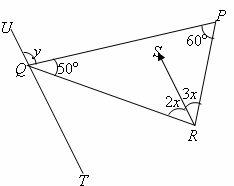 In the diagram $\angle QPR={{60}^{\circ }},\text{ }\angle PQR={{50}^{\circ }},\text{ }QRS=2{{x}^{\circ }},\text{ }\angle SRP=3{{x}^{\circ }},\text{ }\angle UQP={{y}^{\circ }}$ and $RS\parallel TU$calculate y