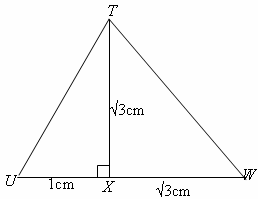 In the diagram TX is perpendicular to UW, $\left| UX \right|=1cm$and $\left| TX \right|=\left| WX \right|=\sqrt{3}cm$ Find $\angle UTW$